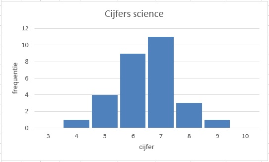 Bekijk het staafdiagram van de rapportcijfers in B1h voor het vak science.