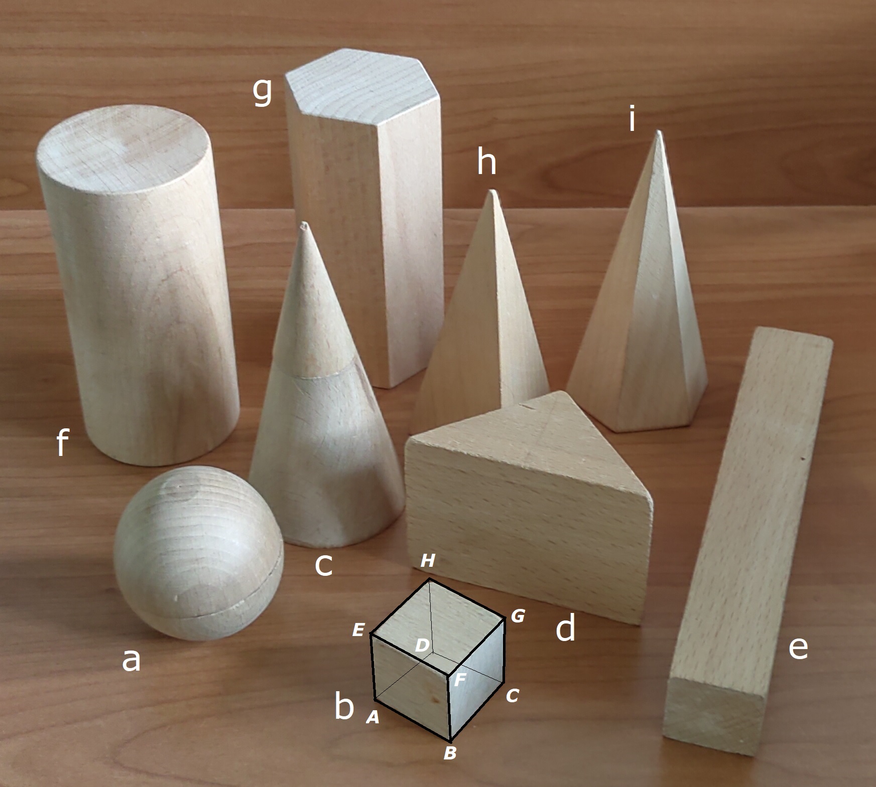 Je ziet hier houten uitvoeringen van ruimtelijke figuren. Om over hun eigenschappen te kunnen praten moet je enkele afspraken maken.