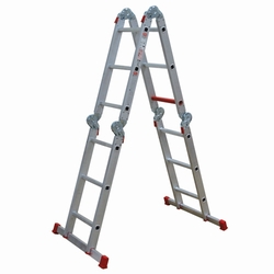 Deze ladder kan op drie plaatsen scharnieren. Nu scharniert hij alleen halverwege. De totale lengte van de ladder als hij helemaal uitgeklapt is (en dus nergens scharniert) bedraagt 4,80 m. In deze stand staan de poten 1 m uit elkaar.