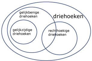 Hier zie je hoe je de verschillende soorten driehoeken kunt weergeven in één figuur. Binnen elk rondje zit de hele verzameling van al die soorten driehoeken. Zo'n figuur heet een Venndiagram naar de Britse wiskundige en filosoof John Venn.