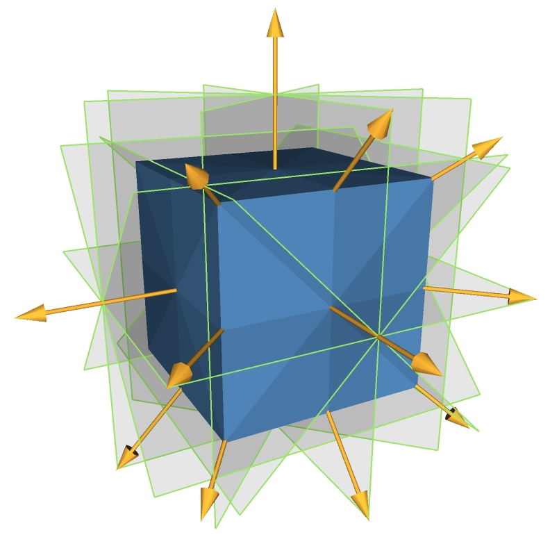 Ook in ruimtelijke figuren komt symmetrie voor. In deze figuur zie je alle symmetrievlakken en symmetrieassen van een kubus.