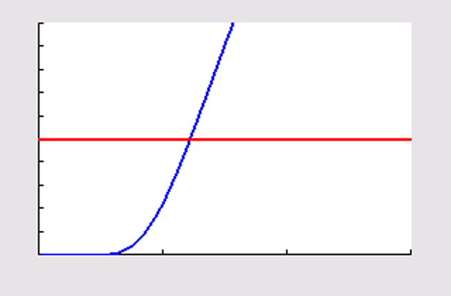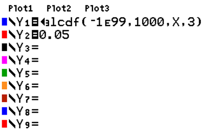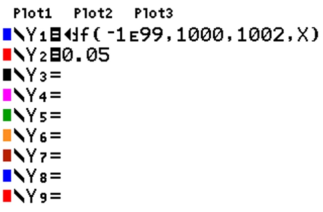 Voor `y_1` voer je de uitdrukking links van het isgelijkteken in, met de variabele `x` als gemiddelde of als standaardafwijking. De horizontale lijn is de lijn `y_2 = 0,05` .